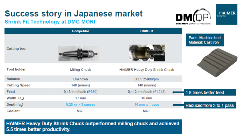 DMG MORI also successfully replaced milling chucks with HAIMER shrink fit hold-ers seeing significant productivity increases of up to 5,5 times. Kazutoyo Moriguchi, Senior Executive Officer Production Engineering and Vice President DMG MORI Iga Co. Ltd. explains: “We have already seen a significant productivity increase of 30% and more in our own production by switching conventional Japanese milling and collet chuck systems into HAIMER shrink fit technology a few years ago.”
