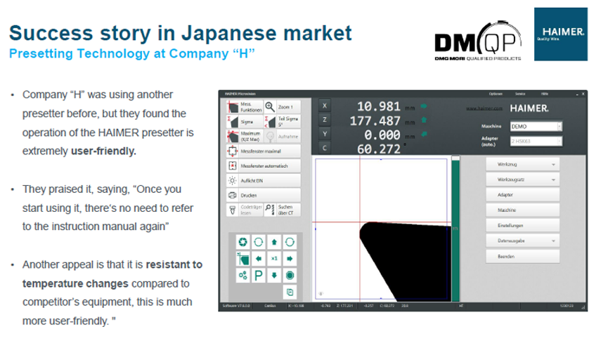 “Our Japanese and global customers can benefit from this partnership to easily ac-cess all our products through DMG MORI. We have seen at joint customers in Japan that HAIMER balancing systems have extended their spindle lifetime on critical ap-plications by up to 300%. Also introducing our Microset presetting technology to large Japanese automotive companies has resulted in higher accuracy, easier soft-ware operations and much fewer calibration cycles due to the thermally stable cast iron base of our machines.”