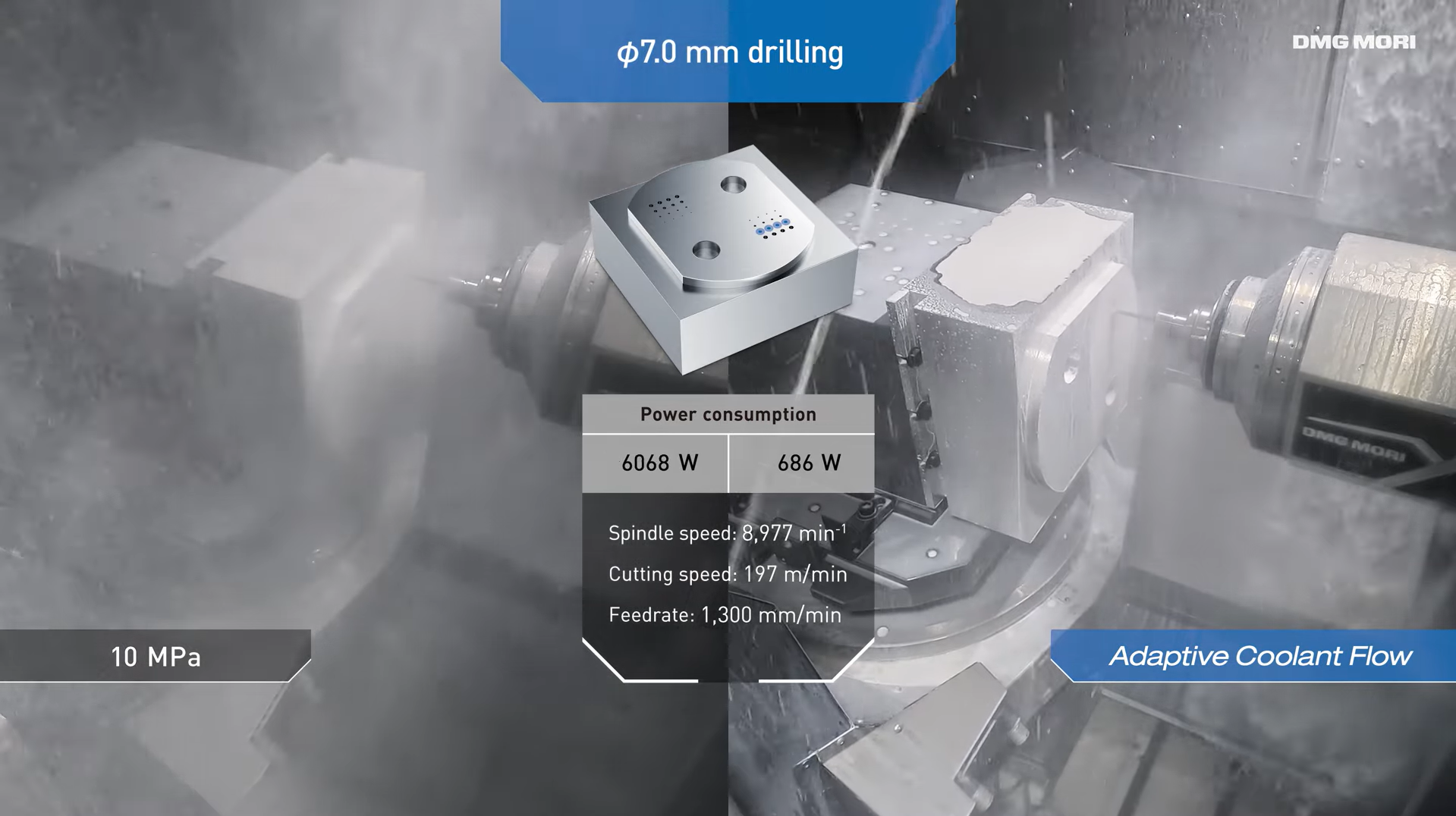 ・Adaptive Coolant Flow also minimizes mist generation and coolant evaporation in the machining area, significantly decreasing total coolant consumption.