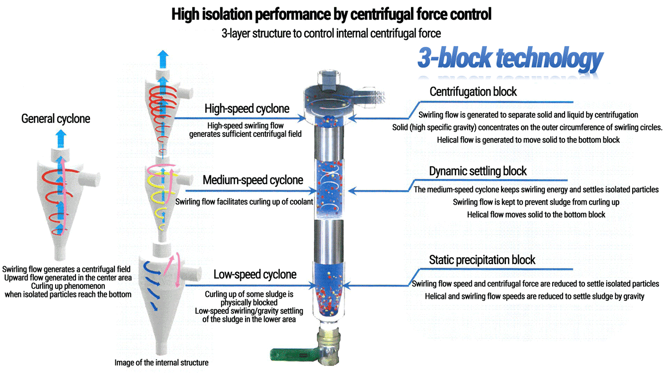 Filters with elements (filter medium) can have clogging problems, and it takes more time and cost to use them because filter elements need to be purchased and replaced. Decrease in the processing flow rate and unstable isolation efficiency caused by clogging inevitably occurs. Moreover, filter elements can become industrial waste after use, which requires huge disposal costs and has harmful effect on the global environment. An alternative that can mostly clear these issues is a general cyclone type filter. But even the cyclone type cannot avoid the decrease in the processing flow rate.