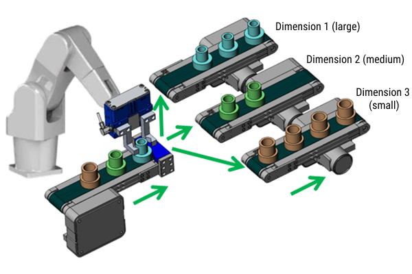 6.Multiple tasks including workpiece transfer are possible. For example, the gripper can measure the dimension of workpieces while transferring and sorting them out by size.