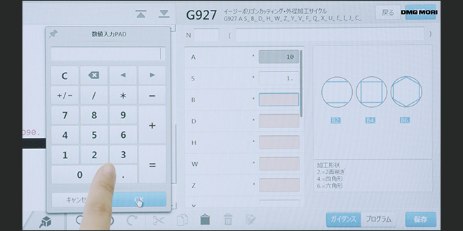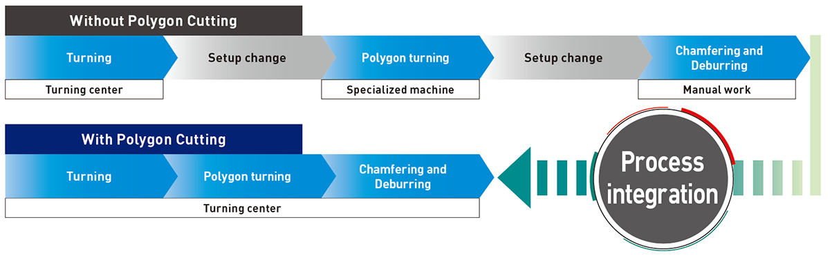 Polygon cutting is a technology cycle that allows easy machining of polygonal shapes with a turning center. Generally, polygonal shape machining is performed on dedicated machines, which require process division and workpiece loading and unloading. By introducing polygon cutting, the process can be consolidated and productivity can be improved.