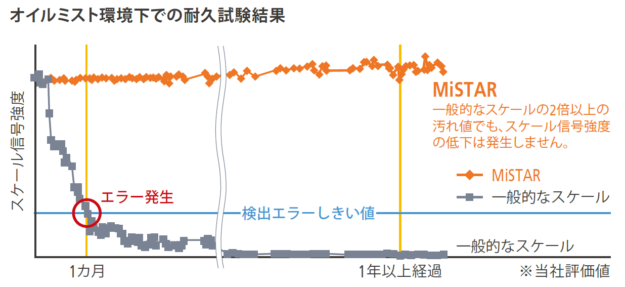 スケール面に油分が付着してもエラーが発生しない耐環境型アブソリュートスケールを採用。オイルミストが舞う環境下においても測定精度の劣化が少なく、こまめにメンテナンスを行う必要がありません。
