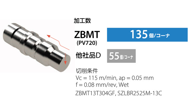そのため、他社製品では1コーナあたり55個だった加工が、ZBMT(PV720)に変更したことにより、1コーナーあたり135個の加工を実現しました。