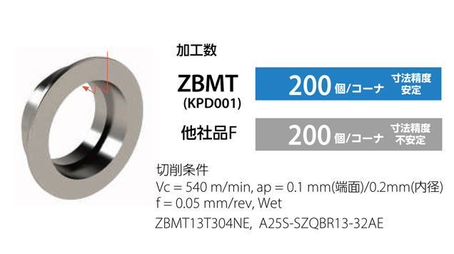 他社品は寸法変動が生じていましたが、ZBMTに変更することで200個以上加工した場合でも安定加工を実現しました。