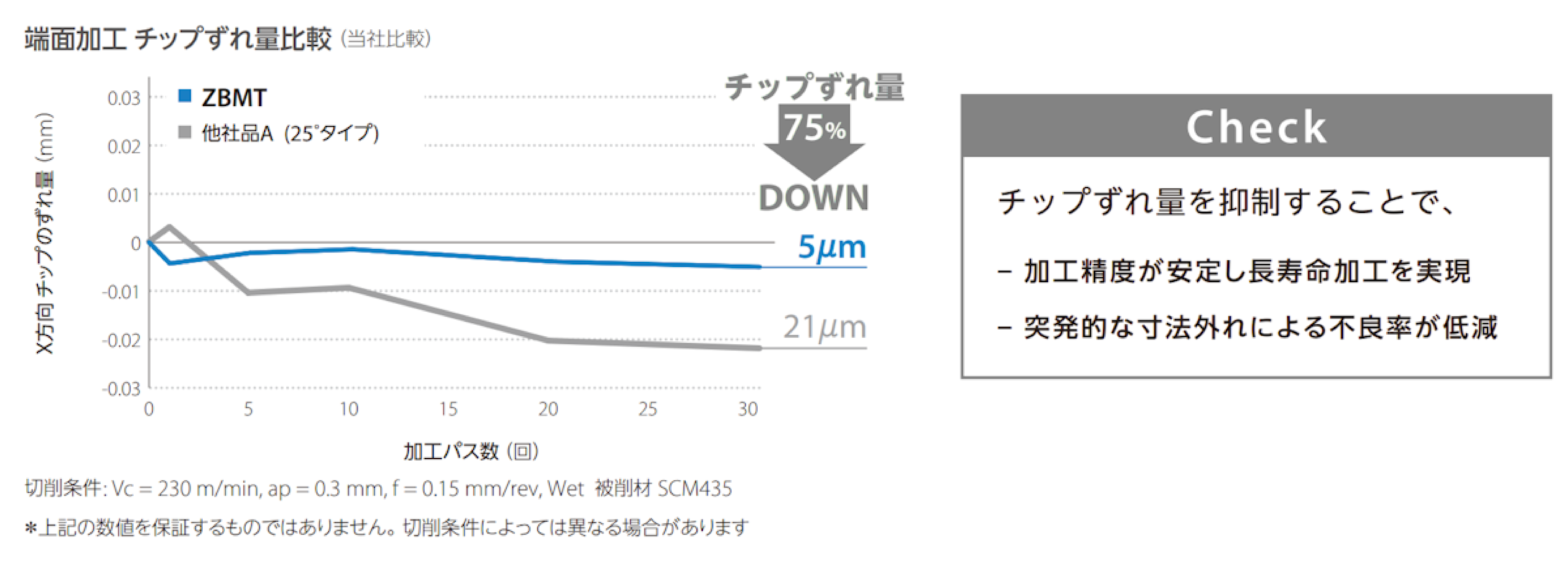 ZBMTはサイドロック機構によりZ方向のインサートずれが軽減、寸法補正が不要になり作業効率が向上しました。