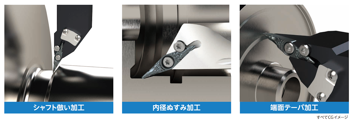 25°インサートをベースに先端部を15°化しているため、多様な加工用途に適用可能です。