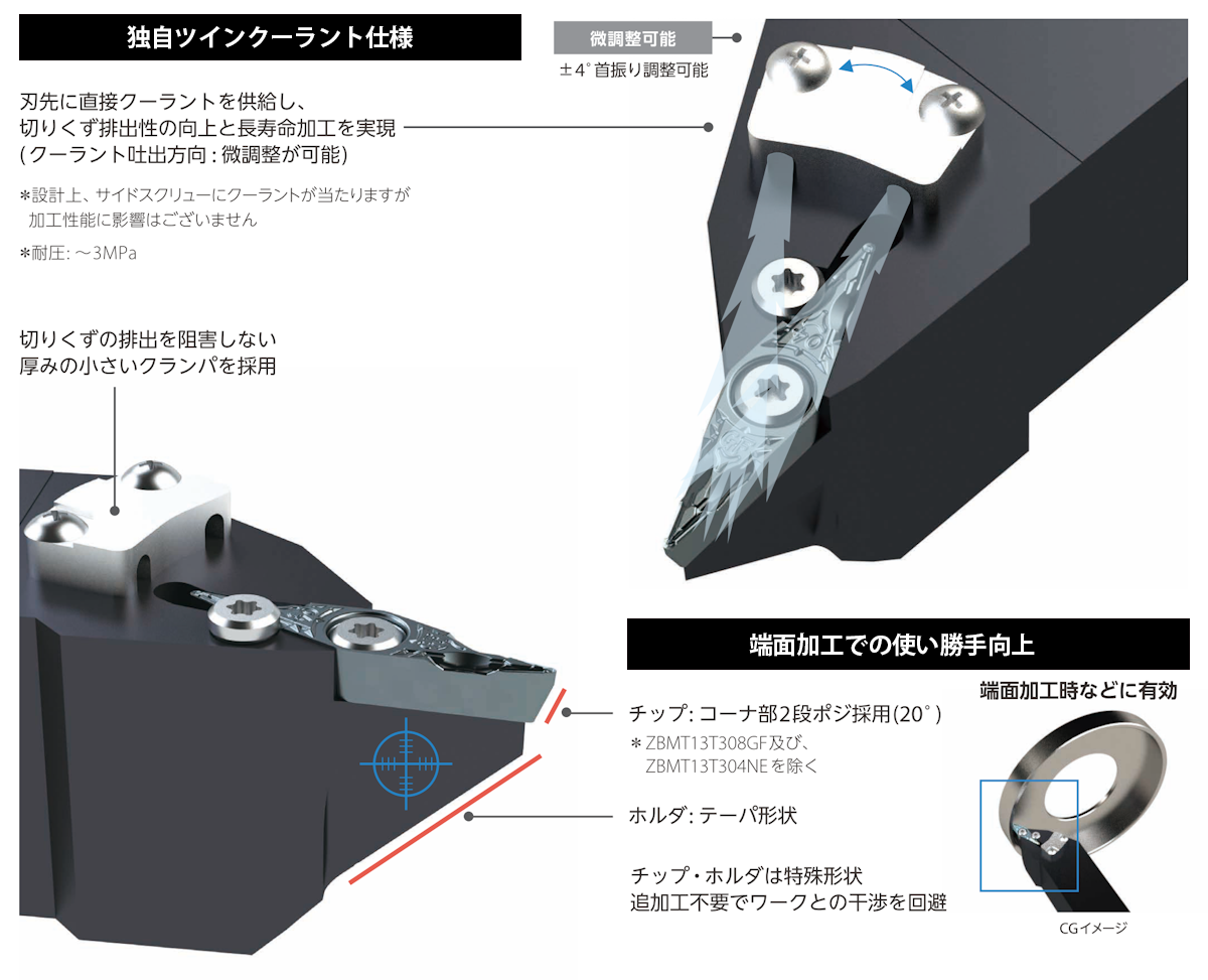 独自ツインクーラント仕様により、刃先に直接クーラントを供給し、切りくず排出性と工具の長寿命化を実現します。