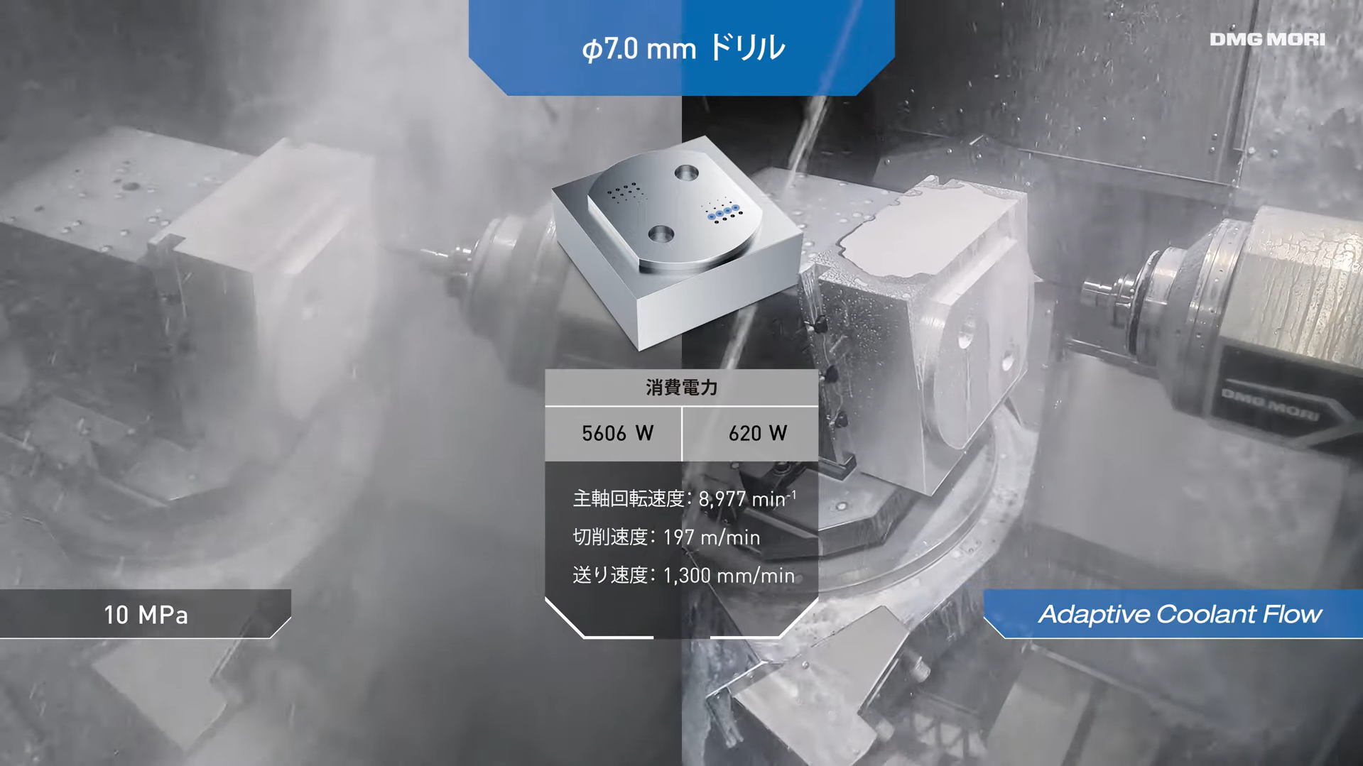 Adaptive Coolant Flowは、加工時に使用する切削工具に合わせて高圧クーラントの流量を最適に調整するアプリケーションです。最適な流量を制御・算出するソフトウェアと、正確に流量を調整して吐出可能なクーラント装置のハードウェアから構成されます。Adaptive Coolant Flowにより、工具寿命とワークの面品位を維持しながら、高圧クーラントポンプの消費電力量を削減し、省エネに貢献します。