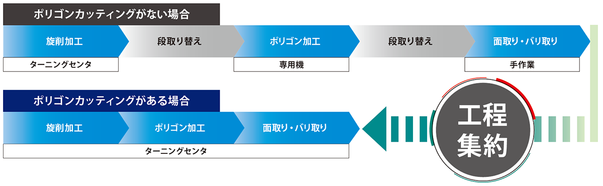 ポリゴンカッティングは、ターニングセンタで多角形状の加工を簡単に行うテクノロジーサイクルです。一般的に多角形状を加工する場合は専用機で行うため工程分割となり、ワークの載せ替えが発生します。ポリゴンカッティングを導入することで、工程集約を行い、生産性の向上を実現します。
