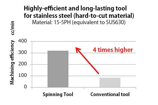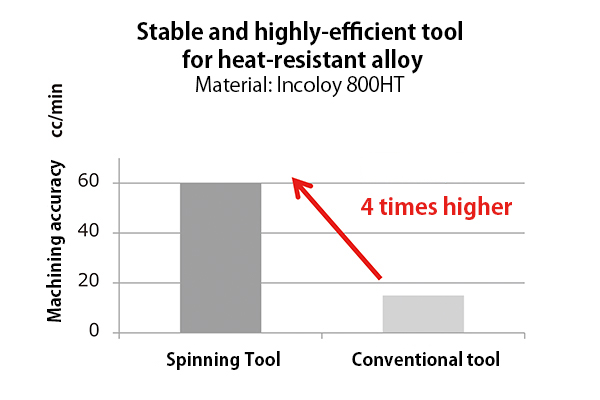 ลูกค้าหลายๆ รายที่จำเป็นต้องตัดวัสดุที่ตัดได้ยาก ยกตัวอย่างเช่น สเตนเลสที่สร้างความร้อนที่ผิวระหว่างตัดซึ่งมีความต้านทานต่อการตัดสูงอาจมีความกังวลใจเกี่ยวกับประสิทธิภาพในการแมชีนนิ่งและความทนทานของส่วนปลายเครื่องมือ เพื่อรับมือกับปัญหาดังกล่าว DMG MORI CO., LTD จึงร่วมมือกับ Sumitomo Electric Hardmetal Corporation คิดค้นและพัฒนา “เครื่องมือหมุน (เครื่องมือแมชีนนิ่งประสิทธิภาพสูงสำหรับวัสดุที่ตัดยาก)” ซึ่งมีอายุการใช้งานยาวนานขึ้น สิ่งที่แตกต่างจากเครื่องมือสำหรับเครื่องกลึงแบบเดิมคือเครื่องมือหมุนรูปแบบใหม่นี้ช่วยให้สามารถหมุนเครื่องมือเพื่อเพิ่มประสิทธิภาพในการแมชีนนิ่งวัสดุที่ตัดยากและยืดอายุการใช้งานให้กับส่วนปลายของเครื่องมือ โดยเครื่องมือนี้เหมาะสำหรับผู้ผลิตในอุตสาหกรรมอากาศยานที่ต้องการเพิ่มความแม่นยำในการแมชีนนิ่งวัสดุที่ตัดได้ยาก