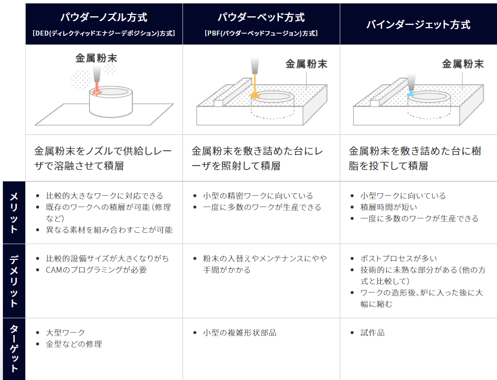 AM技術を用いた加工方法は近年多くの技術が開発されていますが、ここでは主に3つの方式について説明します。金属粉末をノズルで供給しレーザで溶融させて積層するパウダーノズル方式(DED方式)、金属粉末を敷き詰めた台にレーザを照射して積層するパウダーベッド方式(PBF方式)、そして金属粉末を敷き詰めた台に樹脂を投下して積層するバインダージェット方式です。