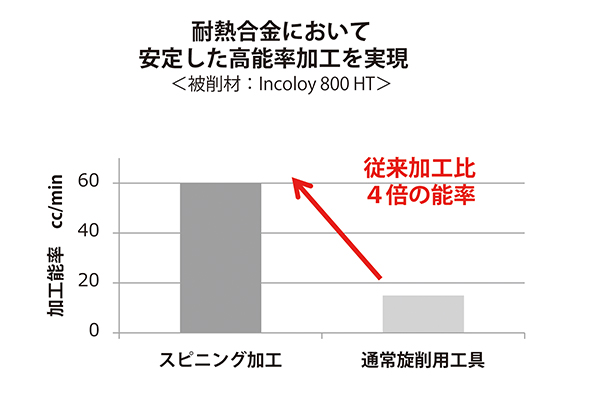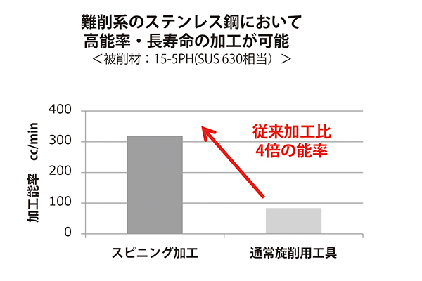 実際に、温度上昇しやすいSUS316加工では、400cc/minを超える加工能率を達成。これは、通常のターニング(旋盤)加工の一般条件と比較して4倍の数値です。