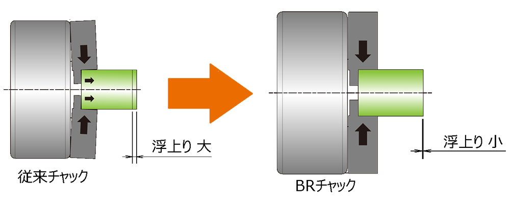 スタンダードチャックでワークを把握すると浮き上がりが発生します。また、ソフトジョー(生爪)を脱着すると把握精度が低下するため、再度取付けした後に再成形が必要になります。これらの問題を解決し、把握精度を大幅に向上させた画期的な製品が北川鉄工所の次世代スタンダードチャック「BRシリーズ」とオプションのTナット「Tnut- Plus」です。