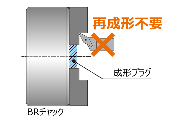 チャックの段取り替え時に必要なソフトジョーの再成形は通常の作業となっており、加工現場では当たり前のようにジョーの再成形をされていると思いますが、そのような常識を覆し、再成形の手間を極力なくす製品が「Tnut-Plus」です。これまでも段取り替え時にジョーの再成形が不要になる製品はありましたが、「Tnut-Plus」は標準BRチャックで標準ソフトジョーが使える製品です。