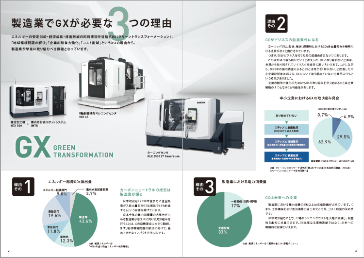 本ガイドブックでは、MX(マシニング・トランスフォーメーション)を実現するための1つとして「GX(グリーン・トランスフォーメーション)と生産性を両立する方法」についてご説明しています。 【どうGXに取り組めばいいか分からないお客様必見!】エネルギーの安定供給・経済成長・排出削減の同時実現を目指すGX(グリーン・トランスフォーメーション)。「地球環境問題の解決」「企業の競争力強化」「コスト削減」という3つの理由から、製造業が早急に取り組むべき課題となっています。しかし、「GXのために何をすればいいか分からない」と悩まれている方もいらっしゃるのではないでしょうか。DMG森精機では、GXを「人、資源、エネルギー、工場面積、時間、全てにおいてリーンでクリーンな生産現場にすること」と位置付けており、MX(マシニング・トランスフォーメーション)に取り組むことがGXの実現につながると考えています。 本ガイドブックでは、消費電力量やCO2排出量を削減するためのGXの取り組み方や各ソリューションについて実例も交えてご紹介します。 >>このようなお客様におすすめ!・製造業でGXが必要な理由を知りたい >>マシニング・トランスフォーメーションとは?マシニングトランスフォーメーション(MX)とは、デジタルトランスフォーメーション(DX)を使って、⼯程集約して⾃動化し、最終的にグリーン・トランスフォーメーション(GX)を実現することです。