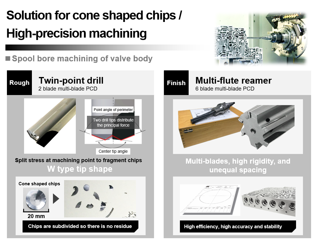 Lỗ ống của thân van được sắp xếp với nhiều loại lỗ khác nhau có đường kính từ Φ8 đến 20 mm trong cấu trúc đa lớp. Công cụ chuyên dụng (mũi khoan gia công thô, cũng như mũi doa hàn cứng bằng kim cương đa tinh thể (PCD) cho gia công hoàn thiện) thường được sử dụng dựa trên cấu trúc lỗ khác nhau. Khách hàng của chúng tôi yêu cầu các sản phẩm "ngăn chặn tạo ra phoi côn ở điểm nhô ra trong quá trình gia công nhôm thô" và "có thể vừa giảm thời gian chu trình, vừa duy trì độ chính xác của gia công".